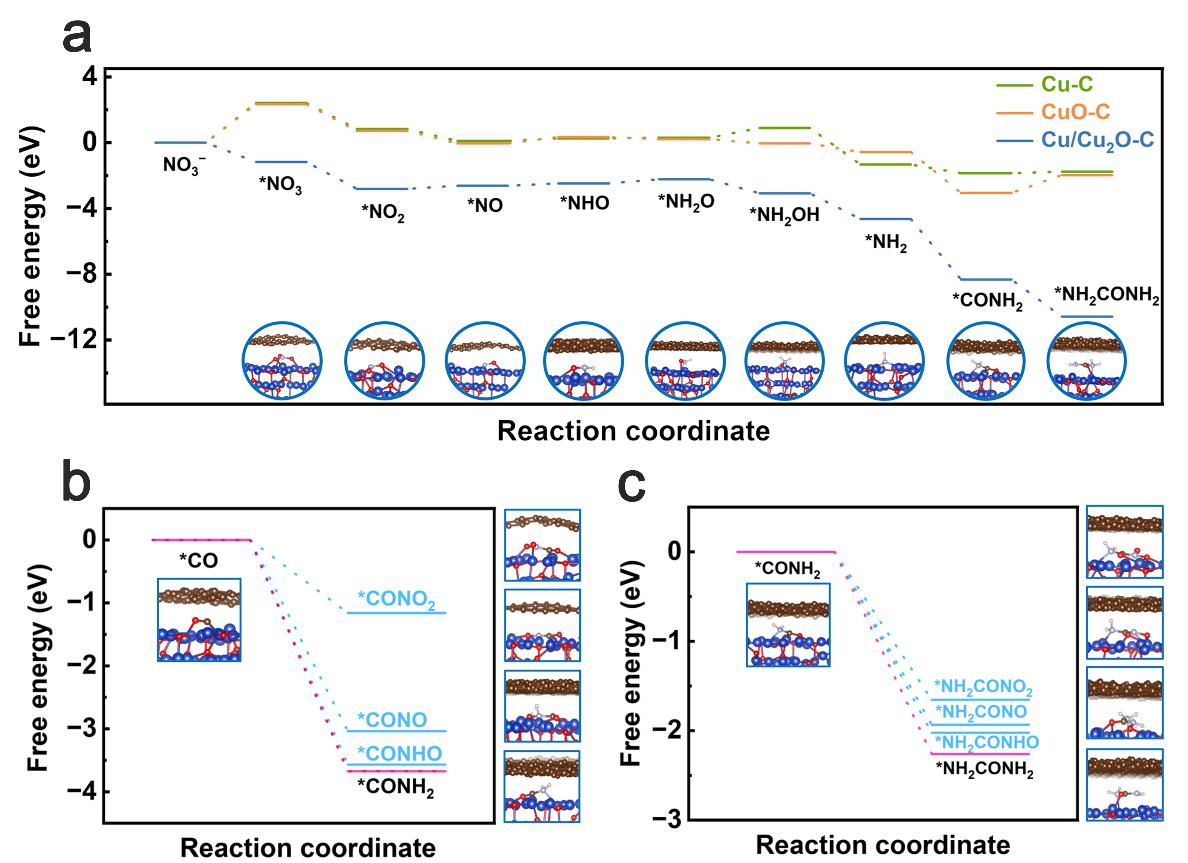 工业生产尿素需要在高温高压的条件下进行,采用可再生能源驱动的尿素电合成是一种可持续的替代方案。现阶段,电化学合成尿素存在法拉第效率和产率较低等问题。本研究制备了一种金属有机框架衍生的Cu/Cu2O-C催化剂,用于高效催化CO2与NO3−电合成尿素。在−0.4 V vs.可逆氢电极电位下,该催化剂可实现68.3%的法拉第效率,对应产率达到1439.6 mg·h−1·gcat−1。结合原位拉曼光谱、原位傅里叶变换红外光谱和密度泛函理论计算证实,碳层有效稳定Cu+/Cu0混合价态,促进CO与NH2之间碳氮偶联形成关键中间体*CONH2。本研究为设计高效金属有机框架衍生材料以推进尿素电合成提供了新思路。